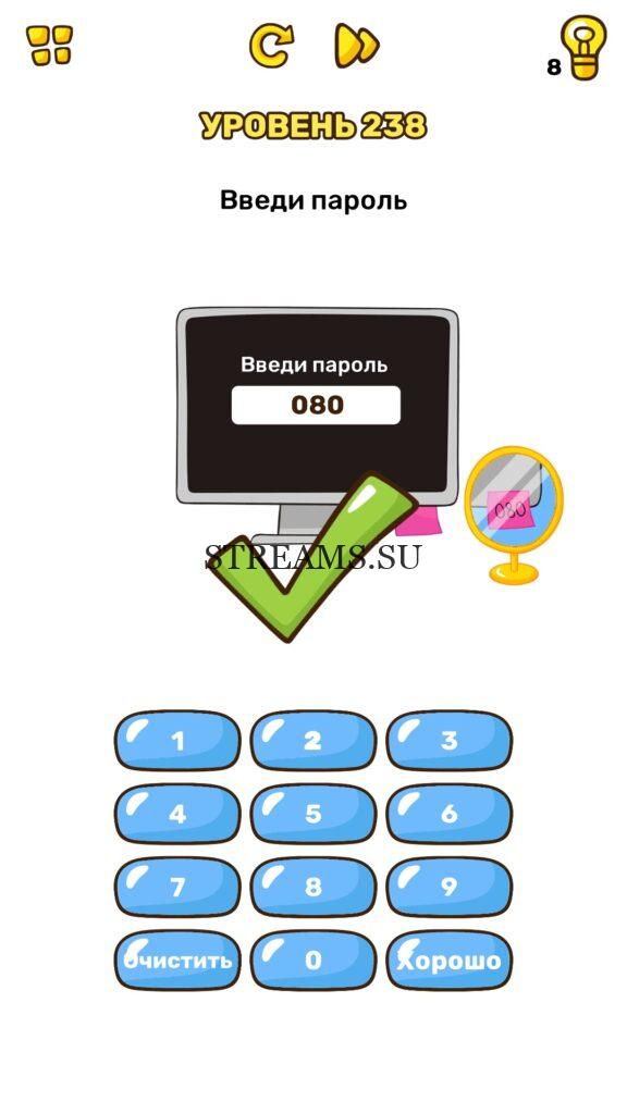 Введите пароль. Уровень 238 — Brain Blow: Тест на гениальность — Ответ на этот уровень находится под фото. Очередная игра от популярных разработчиков головоломок CASUAL AZUR GAMES. Если вы хотите взорвать свой мозг и развить навыки нестандартного мышления, тогда игра Брейн Блоу определенно вам понравится. Если не получается решить задание, то попробуйте включить нестандартное мышление, тряхнуть телефон, погладить его или использовать больше пальцев. Эта игра способна развить в вас навыки следопыта, креативность и прокачать ваш IQ. Но, а если все-же не получается пройти уровень, найдите правильное решение на нашем сайте.