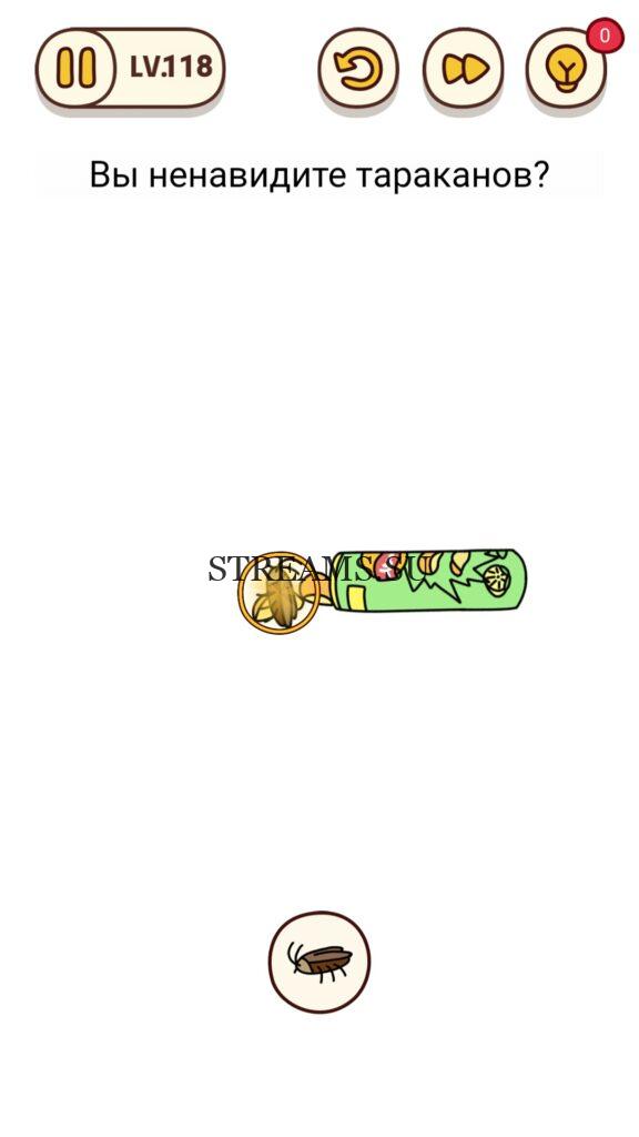 Вы ненавидите тараканов? Уровень 118 — Brain Find– уникальная игра в жанре «головоломка», ответ находится чуть ниже. Она имеет множество уровней и подуровней, которые весело проходить, без особых усилий и траты нервов. Игра нравится многим пользователям из-за приятного музыкального ряда, сопровождающегося весь игровой процесс. Тонко выполненной анимации и красивой графики, над которой поработали разработчики и вложили душу. Уникальность проекта состоит в том, что можно поворачивать экран на некоторых заданиях, увеличивать громкость динамика. То есть, всецело взаимодействовать не только с дисплеем, но и со всем мобильным устройством. На данный момент таких игр мало и не все они доступны в бесплатной версии! Brain Find переведена на русский язык. На нашем сайте, можно получить подсказки, если не получается пройти дальше.