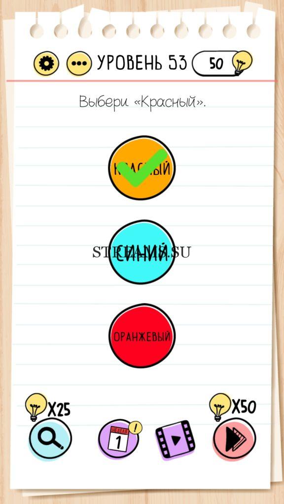 Выбери красный цвет! Уровень 53 — Brain Test — Это самая популярная головоломка, в которой вам предстоит разгадывать непростые задачки. Нужно будет искать нестандартные решения. Название игры говорит само за себя (Тест мозга). С её помощью вы сможете повысить свой IQ, и интеллект. Иногда ответ может быть очень прост. Вы можете играть в компании друзей или родных. Брейн Тест, это отличный способ провести время с пользой и узнать насколько ты умный. Но если вы не можете решить один или несколько уровней, то воспользуйтесь подсказками с нашего сайта.