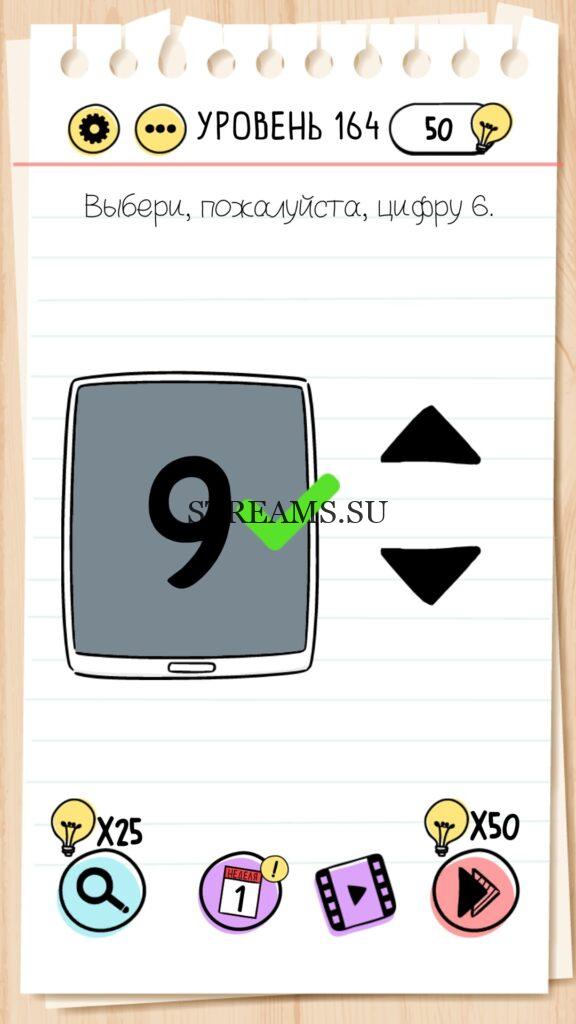 Выбери, пожалуйста, цифру 6. Уровень 164 — Brain Test— Это самая популярная головоломка, в которой вам предстоит разгадывать непростые задачки. Нужно будет искать нестандартные решения. Название игры говорит само за себя (Тест мозга). С её помощью вы сможете повысить свой IQ, и интеллект. Иногда ответ может быть очень прост. Вы можете играть в компании друзей или родных. Брейн Тест, это отличный способ провести время с пользой и узнать насколько ты умный. Но если вы не можете решить один или несколько уровней, то воспользуйтесь подсказками с нашего сайта.