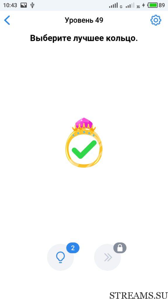 Выберите лучшее кольцо. 49 уровень Easy Game — это интересная но в тоже время сложная головоломка, которая заставит вас включить нестандартное мышление. Прокачайте свой мозг и IQ. Почувствуйте себя самым умным, решая захватывающие и заковыристые задачки. Разработчики Easybrain, обещают, что с помощью этой игры вы сможете развить творческие навыки. Но если не сможете пройти какой-нибудь из уровней, то воспользуйтесь ответами с нашего сайта.