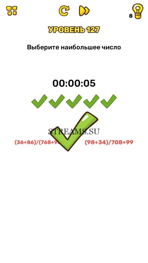 Выберите наибольшее число. Уровень 127 — Brain Blow: Тест на гениальность — Ответ на этот уровень находится под фото. Очередная игра от популярных разработчиков головоломок CASUAL AZUR GAMES. Если вы хотите взорвать свой мозг и развить навыки нестандартного мышления, тогда игра Брейн Блоу определенно вам понравится. Если не получается решить задание, то попробуйте включить нестандартное мышление, тряхнуть телефон, погладить его или использовать больше пальцев. Эта игра способна развить в вас навыки следопыта, креативность и прокачать ваш IQ. Но, а если все-же не получается пройти уровень, найдите правильное решение на нашем сайте.