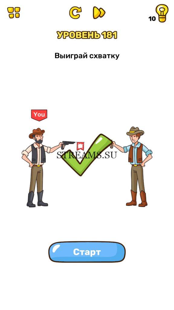 Выиграй схватку. Уровень 181 — Brain Blow: Тест на гениальность — Ответ на этот уровень находится под фото. Очередная игра от популярных разработчиков головоломок CASUAL AZUR GAMES. Если вы хотите взорвать свой мозг и развить навыки нестандартного мышления, тогда игра Брейн Блоу определенно вам понравится. Если не получается решить задание, то попробуйте включить нестандартное мышление, тряхнуть телефон, погладить его или использовать больше пальцев. Эта игра способна развить в вас навыки следопыта, креативность и прокачать ваш IQ. Но, а если все-же не получается пройти уровень, найдите правильное решение на нашем сайте.