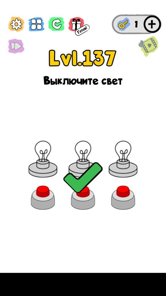 Выключите свет. 137 уровень Trick Me: логические головоломки — Это игра созданная в виде викторины. Каждый новый уровень отличается от предыдущего, что делает игровой процесс затягивающим и интересным. Если ты хочешь узнать насколько ты умный, тогда эта игра точно для тебя! Trick Me поможет тебе развить нестандартное мышление, и повысить свой IQ. В этой игре уже есть 236 уровней, которые постоянно обновляются и пополняются. Но если застрял на одном или нескольких уровнях, и не можешь их пройти, то наш сайт придет на помощь, у нас есть все ответы на уровни игры Trick Me.