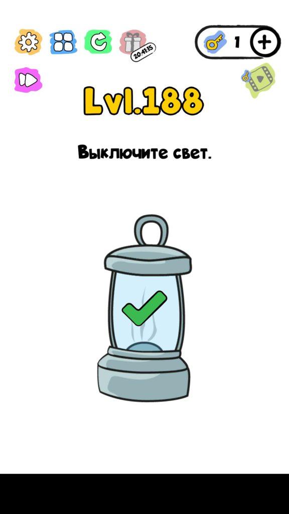 Выключите свет. 188 уровень Trick Me: логические головоломки — Это игра созданная в виде викторины. Каждый новый уровень отличается от предыдущего, что делает игровой процесс затягивающим и интересным. Если ты хочешь узнать насколько ты умный, тогда эта игра точно для тебя! Trick Me поможет тебе развить нестандартное мышление, и повысить свой IQ. В этой игре уже есть 236 уровней, которые постоянно обновляются и пополняются. Но если застрял на одном или нескольких уровнях, и не можешь их пройти, то наш сайт придет на помощь, у нас есть все ответы на уровни игры Trick Me.