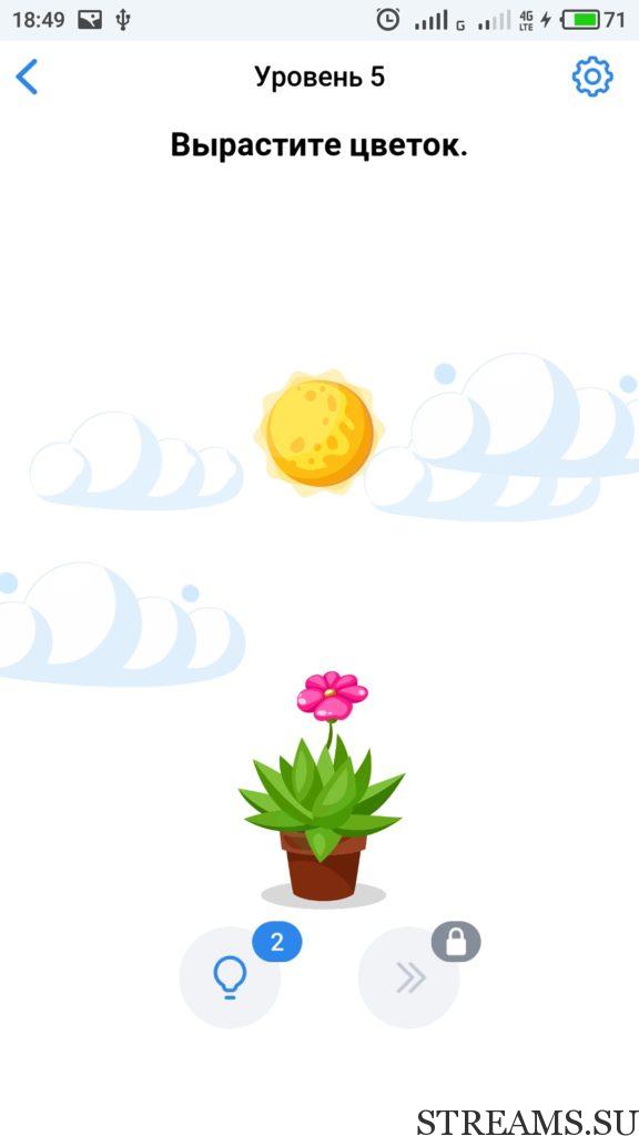 Вырастите цветок. 5 уровень Easy Game — это интересная но в тоже время сложная головоломка, которая заставит вас включить нестандартное мышление. Прокачайте свой мозг и IQ. Почувствуйте себя самым умным, решая захватывающие и заковыристые задачки. Разработчики Easybrain, обещают, что с помощью этой игры вы сможете развить творческие навыки. Но если не сможете пройти какой-нибудь из уровней, то воспользуйтесь ответами с нашего сайта.