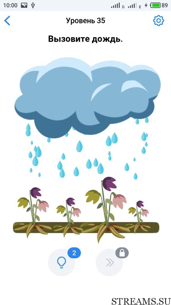 Вызовите дождь. 35 уровень Easy Game — это интересная но в тоже время сложная головоломка, которая заставит вас включить нестандартное мышление. Прокачайте свой мозг и IQ. Почувствуйте себя самым умным, решая захватывающие и заковыристые задачки. Разработчики Easybrain, обещают, что с помощью этой игры вы сможете развить творческие навыки. Но если не сможете пройти какой-нибудь из уровней, то воспользуйтесь ответами с нашего сайта.