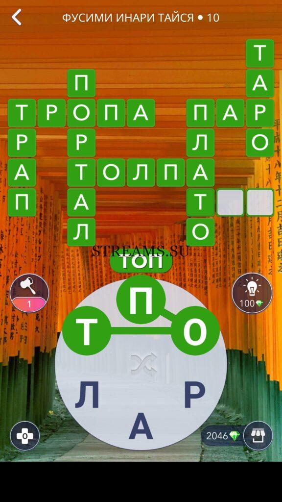 WOW ответы — Уровень 10: ФУСИМИ ИНАРИ ТАЙСЯ. (345 — ВОЯЖ) В этом уровне нам нужно составить слова из следующих букв: «АПТЛРО«. Готовы совершить кругосветное путешествие? Эта чудесная игра исполнит ваше желание! С каждым последующим уровнем, будет расти сложность заданий. Игра WOW создана в виде кроссворда, в котором нужно будет соединять буквы, чтобы получить несколько слов. Чем больше вы будете отгадывать слов, тем проще будет отгадать остальное. С помощью Words of Wonders вы сможете расширить свой словарный запас, улучшить внимательность и хорошенько прокачать свой мозг! Если вы не можете пройти один из уровней, воспользуйтесь подсказкой с нашего сайта.