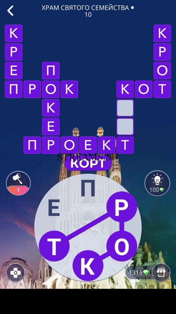 WOW ответы — Уровень 10: ХРАМ СВЯТОГО СЕМЕЙСТВА. (169 — ВОЯЖ) В этом уровне нам нужно составить слова из следующих букв: «ПРОКТЕ«. Готовы совершить кругосветное путешествие? Эта чудесная игра исполнит ваше желание! С каждым последующим уровнем, будет расти сложность заданий. Игра WOW создана в виде кроссворда, в котором нужно будет соединять буквы, чтобы получить несколько слов. Чем больше вы будете отгадывать слов, тем проще будет отгадать остальное. С помощью Words of Wonders вы сможете расширить свой словарный запас, улучшить внимательность и хорошенько прокачать свой мозг! Если вы не можете пройти один из уровней, воспользуйтесь подсказкой с нашего сайта.