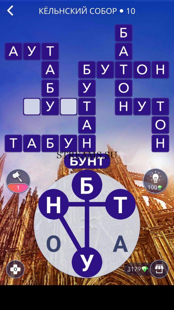 WOW ответы — Уровень 10: КЁЛЬНСКИЙ СОБОР. (601 — ВОЯЖ) В этом уровне нам нужно составить слова из следующих букв: «ОБТНАУ«. Готовы совершить кругосветное путешествие? Эта чудесная игра исполнит ваше желание! С каждым последующим уровнем, будет расти сложность заданий. Игра WOW создана в виде кроссворда, в котором нужно будет соединять буквы, чтобы получить несколько слов. Чем больше вы будете отгадывать слов, тем проще будет отгадать остальное. С помощью Words of Wonders вы сможете расширить свой словарный запас, улучшить внимательность и хорошенько прокачать свой мозг! Если вы не можете пройти один из уровней, воспользуйтесь подсказкой с нашего сайта.