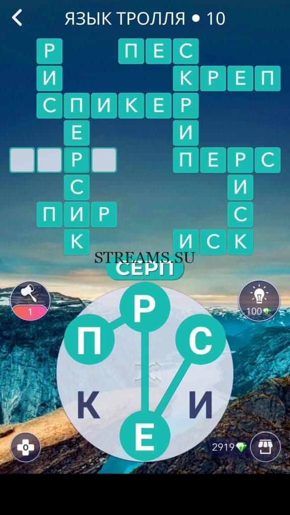 WOW ответы — Уровень 10: ЯЗЫК ТРОЛЛЯ. (553 — ВОЯЖ) В этом уровне нам нужно составить слова из следующих букв: «СКРЕПИ«. Готовы совершить кругосветное путешествие? Эта чудесная игра исполнит ваше желание! С каждым последующим уровнем, будет расти сложность заданий. Игра WOW создана в виде кроссворда, в котором нужно будет соединять буквы, чтобы получить несколько слов. Чем больше вы будете отгадывать слов, тем проще будет отгадать остальное. С помощью Words of Wonders вы сможете расширить свой словарный запас, улучшить внимательность и хорошенько прокачать свой мозг! Если вы не можете пройти один из уровней, воспользуйтесь подсказкой с нашего сайта.