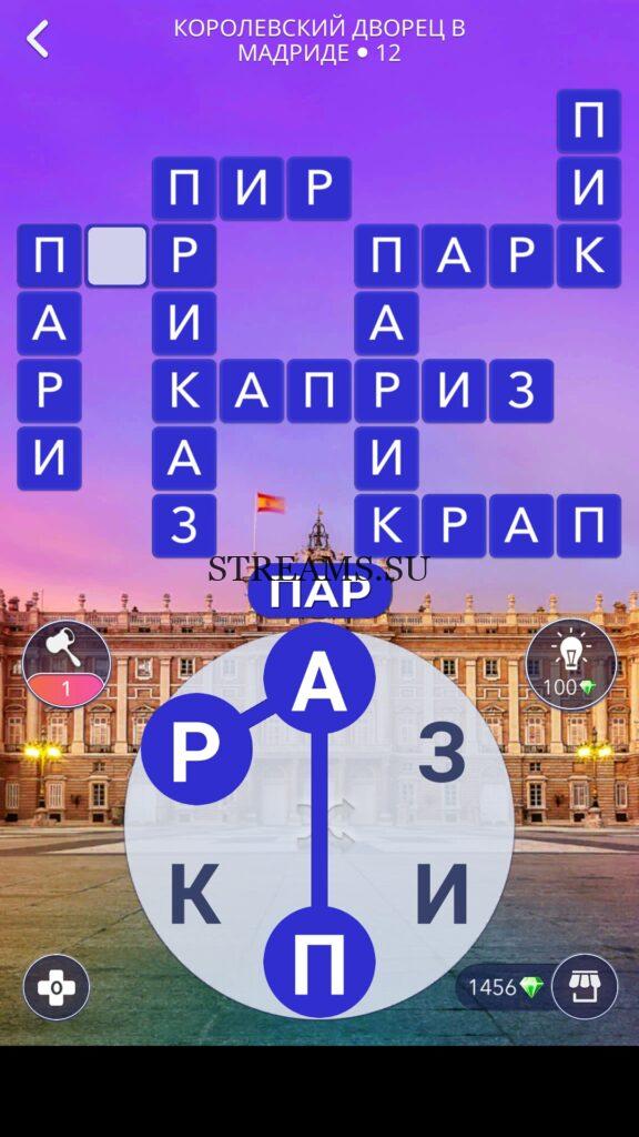 WOW ответы — Уровень 12: КОРОЛЕВСКИЙ ДВОРЕЦ В МАДРИДЕ. (219 — ВОЯЖ) В этом уровне нам нужно составить слова из следующих букв: «КАРИПЗ«. Готовы совершить кругосветное путешествие? Эта чудесная игра исполнит ваше желание! С каждым последующим уровнем, будет расти сложность заданий. Игра WOW создана в виде кроссворда, в котором нужно будет соединять буквы, чтобы получить несколько слов. Чем больше вы будете отгадывать слов, тем проще будет отгадать остальное. С помощью Words of Wonders вы сможете расширить свой словарный запас, улучшить внимательность и хорошенько прокачать свой мозг! Если вы не можете пройти один из уровней, воспользуйтесь подсказкой с нашего сайта.
