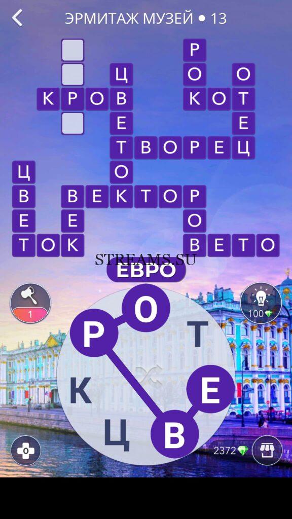 WOW ответы — Уровень 13: ЭРМИТАЖ МУЗЕЙ. (412 — ВОЯЖ) В этом уровне нам нужно составить слова из следующих букв: «КЦВОТРЕ«. Готовы совершить кругосветное путешествие? Эта чудесная игра исполнит ваше желание! С каждым последующим уровнем, будет расти сложность заданий. Игра WOW создана в виде кроссворда, в котором нужно будет соединять буквы, чтобы получить несколько слов. Чем больше вы будете отгадывать слов, тем проще будет отгадать остальное. С помощью Words of Wonders вы сможете расширить свой словарный запас, улучшить внимательность и хорошенько прокачать свой мозг! Если вы не можете пройти один из уровней, воспользуйтесь подсказкой с нашего сайта.