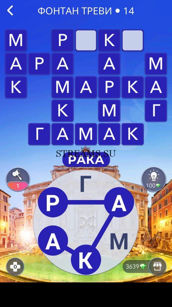 WOW ответы — Уровень 14: ФОНТАН ТРЕВИ. (717 — ВОЯЖ) В этом уровне нам нужно составить слова из следующих букв: «КРАМАГ«. Готовы совершить кругосветное путешествие? Эта чудесная игра исполнит ваше желание! С каждым последующим уровнем, будет расти сложность заданий. Игра WOW создана в виде кроссворда, в котором нужно будет соединять буквы, чтобы получить несколько слов. Чем больше вы будете отгадывать слов, тем проще будет отгадать остальное. С помощью Words of Wonders вы сможете расширить свой словарный запас, улучшить внимательность и хорошенько прокачать свой мозг! Если вы не можете пройти один из уровней, воспользуйтесь подсказкой с нашего сайта.