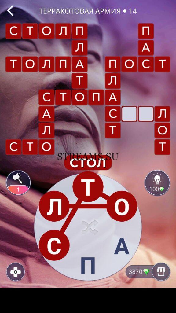 WOW ответы — Уровень 14: ТЕРРАКОТОВАЯ АРМИЯ. (749 — ВОЯЖ) В этом уровне нам нужно составить слова из следующих букв: «ТОАПСЛ«. Готовы совершить кругосветное путешествие? Эта чудесная игра исполнит ваше желание! С каждым последующим уровнем, будет расти сложность заданий. Игра WOW создана в виде кроссворда, в котором нужно будет соединять буквы, чтобы получить несколько слов. Чем больше вы будете отгадывать слов, тем проще будет отгадать остальное. С помощью Words of Wonders вы сможете расширить свой словарный запас, улучшить внимательность и хорошенько прокачать свой мозг! Если вы не можете пройти один из уровней, воспользуйтесь подсказкой с нашего сайта.
