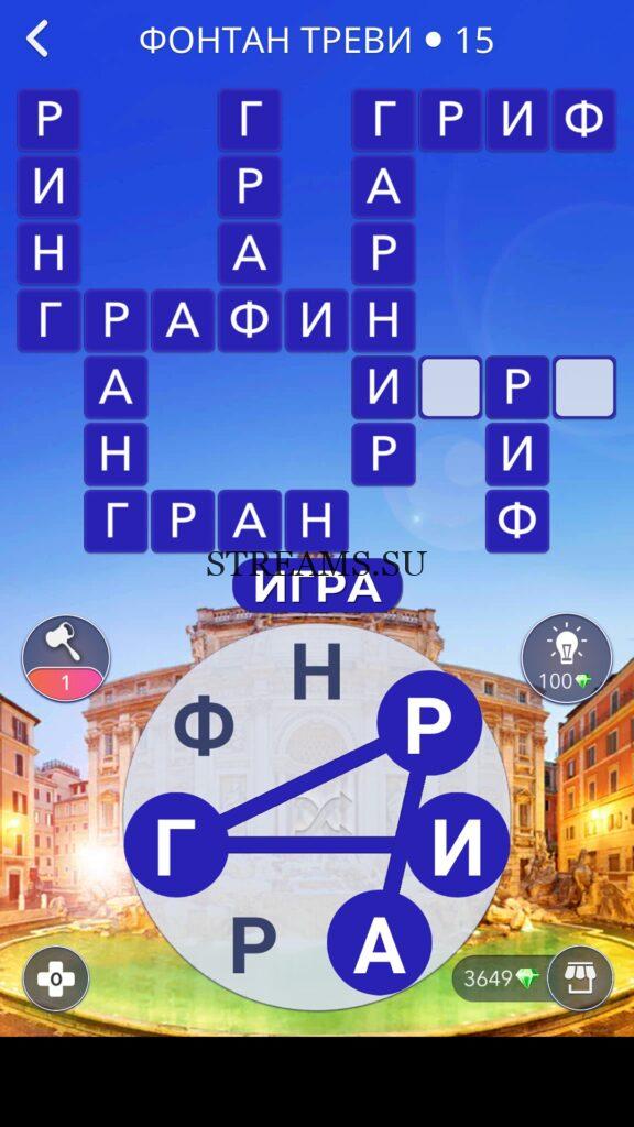 WOW ответы — Уровень 15: ФОНТАН ТРЕВИ. (718 — ВОЯЖ) В этом уровне нам нужно составить слова из следующих букв: «НРИАРГФ«. Готовы совершить кругосветное путешествие? Эта чудесная игра исполнит ваше желание! С каждым последующим уровнем, будет расти сложность заданий. Игра WOW создана в виде кроссворда, в котором нужно будет соединять буквы, чтобы получить несколько слов. Чем больше вы будете отгадывать слов, тем проще будет отгадать остальное. С помощью Words of Wonders вы сможете расширить свой словарный запас, улучшить внимательность и хорошенько прокачать свой мозг! Если вы не можете пройти один из уровней, воспользуйтесь подсказкой с нашего сайта.