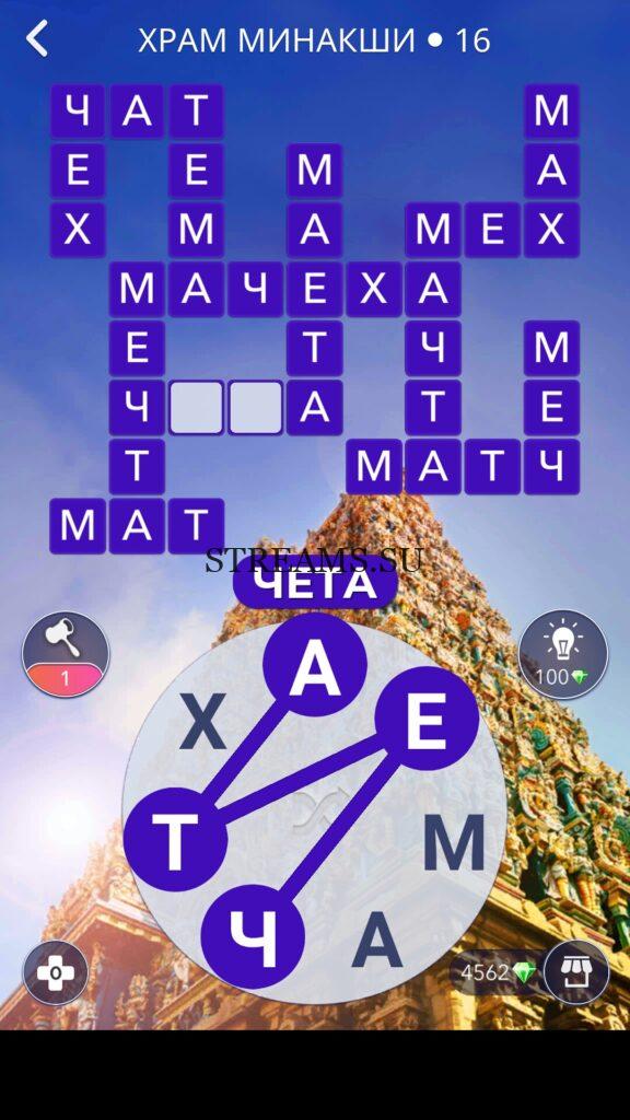 WOW ответы — Уровень 16: ХРАМ МИНАКШИ. (879 — ВОЯЖ) В этом уровне нам нужно будет составить слова из следующих букв: «ЕААТХЧМ«. Words of Wonders отправляет игрока в кругосветное путешествие по миру. В ходе приключения пользователи потренируют свою память и узнают множество уникальных слов, исследуют удивительные города. Игра представляет собой онлайн-кроссворд. Многообразие привлекает новичков в WoW. И сотни часов не хватит, чтобы пройти все уровни. Такое разнообразие достигается обилием игрового контента. Наш сайт подскажет прохождение каждой локации. Игра предлагает выбор из десятков стран, в каждой свои достопримечательности. Места расширят кругозор играющих и поделятся новыми понятиями для развития речи.