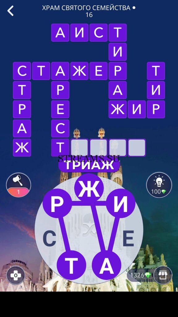 WOW ответы — Уровень 16: ХРАМ СВЯТОГО СЕМЕЙСТВА. (175 — ВОЯЖ) В этом уровне нам нужно составить слова из следующих букв: «РТИАЖСЕ«. Готовы совершить кругосветное путешествие? Эта чудесная игра исполнит ваше желание! С каждым последующим уровнем, будет расти сложность заданий. Игра WOW создана в виде кроссворда, в котором нужно будет соединять буквы, чтобы получить несколько слов. Чем больше вы будете отгадывать слов, тем проще будет отгадать остальное. С помощью Words of Wonders вы сможете расширить свой словарный запас, улучшить внимательность и хорошенько прокачать свой мозг! Если вы не можете пройти один из уровней, воспользуйтесь подсказкой с нашего сайта.