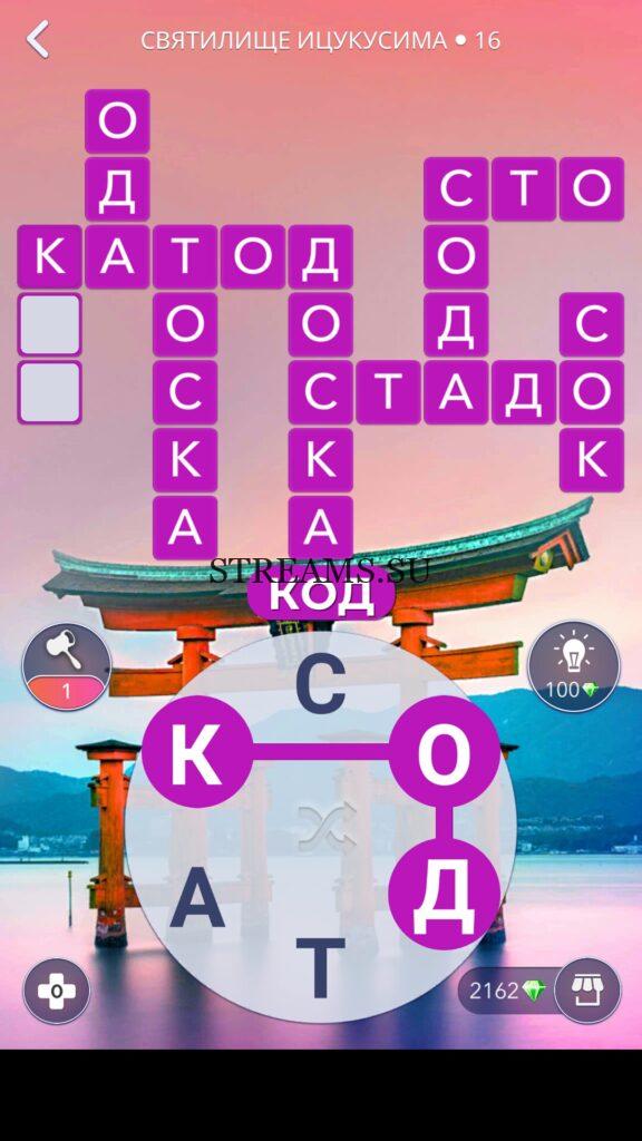 WOW ответы — Уровень 16: СВЯТИЛИЩЕ ИЦУКУСИМА. (383 — ВОЯЖ) В этом уровне нам нужно составить слова из следующих букв: «ОКТСАД«. Готовы совершить кругосветное путешествие? Эта чудесная игра исполнит ваше желание! С каждым последующим уровнем, будет расти сложность заданий. Игра WOW создана в виде кроссворда, в котором нужно будет соединять буквы, чтобы получить несколько слов. Чем больше вы будете отгадывать слов, тем проще будет отгадать остальное. С помощью Words of Wonders вы сможете расширить свой словарный запас, улучшить внимательность и хорошенько прокачать свой мозг! Если вы не можете пройти один из уровней, воспользуйтесь подсказкой с нашего сайта.
