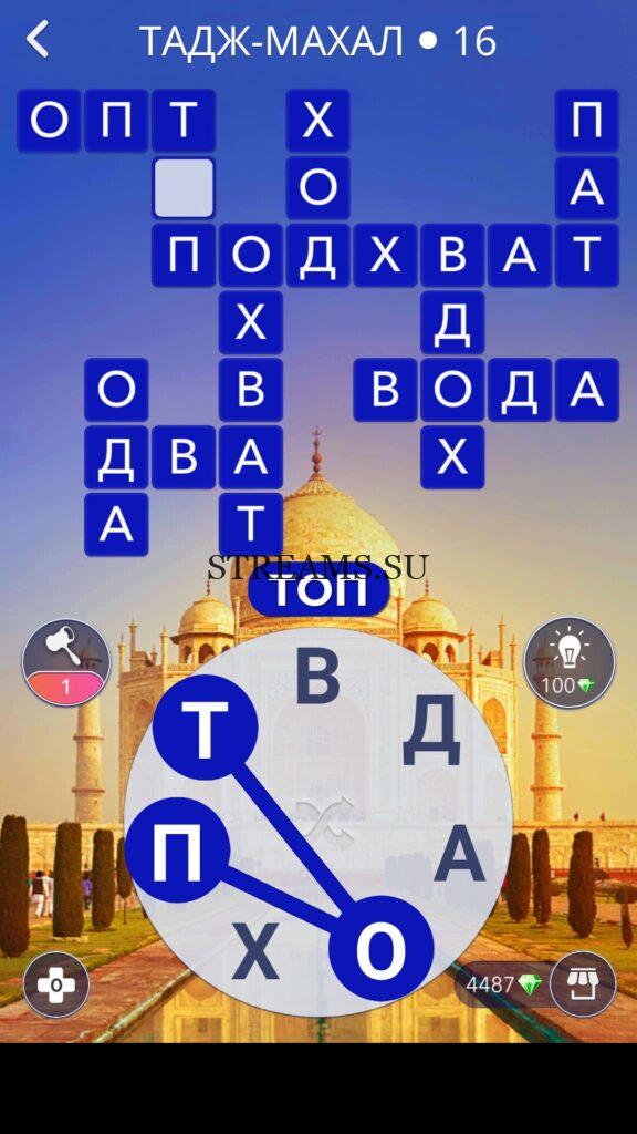 WOW ответы — Уровень 16: ТАДЖ-МАХАЛ. (863 — ВОЯЖ) В этом уровне нам нужно составить слова из следующих букв: «ПХВОДАТ«. Готовы совершить кругосветное путешествие? Эта чудесная игра исполнит ваше желание! С каждым последующим уровнем, будет расти сложность заданий. Игра WOW создана в виде кроссворда, в котором нужно будет соединять буквы, чтобы получить несколько слов. Чем больше вы будете отгадывать слов, тем проще будет отгадать остальное. С помощью Words of Wonders вы сможете расширить свой словарный запас, улучшить внимательность и хорошенько прокачать свой мозг! Если вы не можете пройти один из уровней, воспользуйтесь подсказкой с нашего сайта.