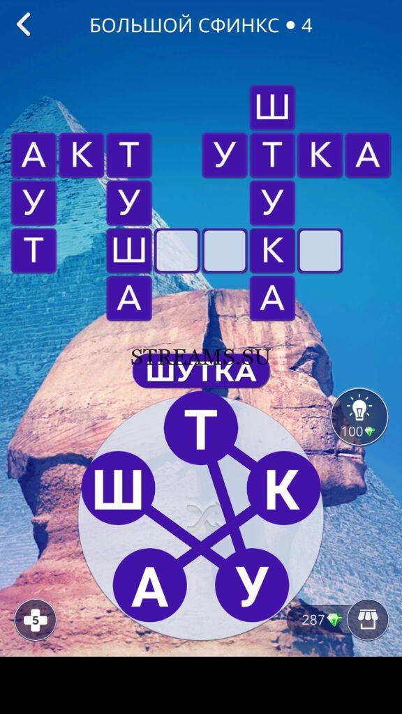 WOW ответы — Уровень 4: БОЛЬШОЙ СФИНКС. (7 — ВОЯЖ) В этом уровне нам нужно составить слова из следующих букв: «ТУАШК«. Готовы совершить кругосветное путешествие? Эта чудесная игра исполнит ваше желание! С каждым последующим уровнем, будет расти сложность заданий. Игра WOW создана в виде кроссворда, в котором нужно будет соединять буквы, чтобы получить несколько слов. Чем больше вы будете отгадывать слов, тем проще будет отгадать остальное. С помощью Words of Wonders вы сможете расширить свой словарный запас, улучшить внимательность и хорошенько прокачать свой мозг! Если вы не можете пройти один из уровней, воспользуйтесь подсказкой с нашего сайта.