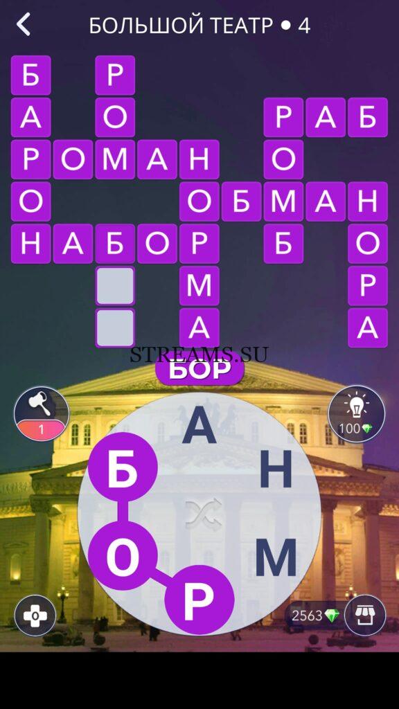 WOW ответы — Уровень 4: БОЛЬШОЙ ТЕАТР. (467 — ВОЯЖ) В этом уровне нам нужно составить слова из следующих букв: «АНМРОБ«. Готовы совершить кругосветное путешествие? Эта чудесная игра исполнит ваше желание! С каждым последующим уровнем, будет расти сложность заданий. Игра WOW создана в виде кроссворда, в котором нужно будет соединять буквы, чтобы получить несколько слов. Чем больше вы будете отгадывать слов, тем проще будет отгадать остальное. С помощью Words of Wonders вы сможете расширить свой словарный запас, улучшить внимательность и хорошенько прокачать свой мозг! Если вы не можете пройти один из уровней, воспользуйтесь подсказкой с нашего сайта.