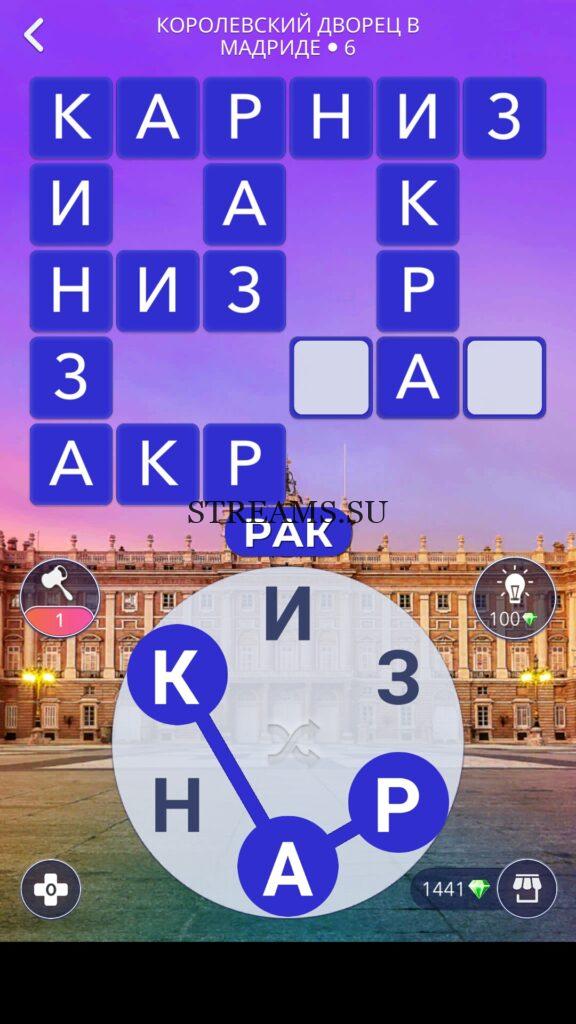 WOW ответы — Уровень 6: КОРОЛЕВСКИЙ ДВОРЕЦ В МАДРИДЕ. (213 — ВОЯЖ) В этом уровне нам нужно составить слова из следующих букв: «КРЗНАИ«. Готовы совершить кругосветное путешествие? Эта чудесная игра исполнит ваше желание! С каждым последующим уровнем, будет расти сложность заданий. Игра WOW создана в виде кроссворда, в котором нужно будет соединять буквы, чтобы получить несколько слов. Чем больше вы будете отгадывать слов, тем проще будет отгадать остальное. С помощью Words of Wonders вы сможете расширить свой словарный запас, улучшить внимательность и хорошенько прокачать свой мозг! Если вы не можете пройти один из уровней, воспользуйтесь подсказкой с нашего сайта.