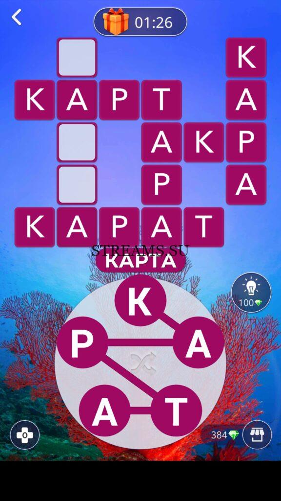 Все слова заключенные в этой анаграмме приведены на фото выше: «АКР», «КАРА», «ТАРА», «КАРАТ», «КАРТ», «КАРТА»
