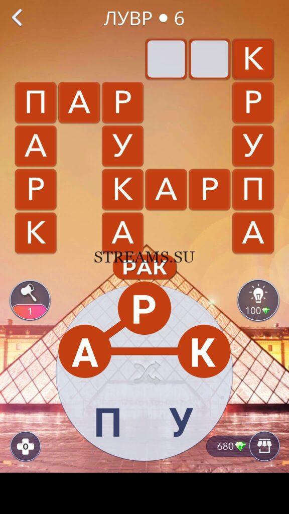 WOW ответы — Уровень 6: ЛУВР. (45 — ВОЯЖ) В этом уровне нам нужно составить слова из следующих букв: «КРАПУ«. Готовы совершить кругосветное путешествие? Эта чудесная игра исполнит ваше желание! С каждым последующим уровнем, будет расти сложность заданий. Игра WOW создана в виде кроссворда, в котором нужно будет соединять буквы, чтобы получить несколько слов. Чем больше вы будете отгадывать слов, тем проще будет отгадать остальное. С помощью Words of Wonders вы сможете расширить свой словарный запас, улучшить внимательность и хорошенько прокачать свой мозг! Если вы не можете пройти один из уровней, воспользуйтесь подсказкой с нашего сайта.