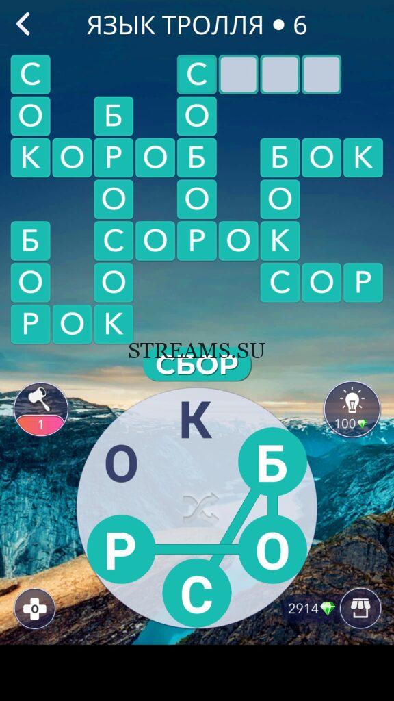 WOW ответы — Уровень 6: ЯЗЫК ТРОЛЛЯ. (549 — ВОЯЖ) В этом уровне нам нужно составить слова из следующих букв: «КБОСРО«. Готовы совершить кругосветное путешествие? Эта чудесная игра исполнит ваше желание! С каждым последующим уровнем, будет расти сложность заданий. Игра WOW создана в виде кроссворда, в котором нужно будет соединять буквы, чтобы получить несколько слов. Чем больше вы будете отгадывать слов, тем проще будет отгадать остальное. С помощью Words of Wonders вы сможете расширить свой словарный запас, улучшить внимательность и хорошенько прокачать свой мозг! Если вы не можете пройти один из уровней, воспользуйтесь подсказкой с нашего сайта.