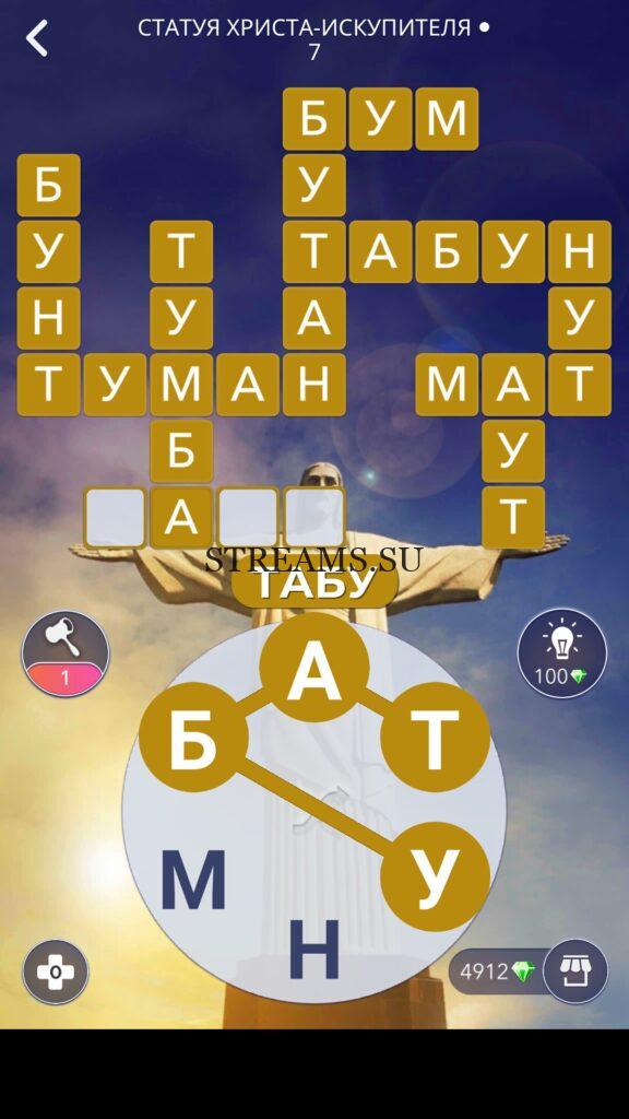 WOW ответы — Уровень 7: СТАТУЯ ХРИСТА-ИСКУПИТЕЛЯ. (934 — ВОЯЖ) В этом уровне нам нужно будет составить слова из следующих букв: «АТУНМБ«. Геймеры хотят развивать свою речь, узнавать новые понятия и получать информацию о чудесах света. Игра Words of Wonders для Android отвечает этим требованиям. Онлайн-кроссворд предлагает игрокам кругосветное путешествие, в ходе которого нужно находить и выделять спрятанные слова на игровом поле. Придется здорово напрячь память и сконцентрировать внимание. WoW привлекает разнообразием задач и кроссвордов. Десятков часов не хватит, чтобы найти все, что спрятали разработчики. Многообразие контента поражает, уровни просто не заканчиваются. Пользователи выбирают позицию по странам, в каждой есть несколько достопримечательностей. Ответы на эту игру всегда доступны на нашем сайте!