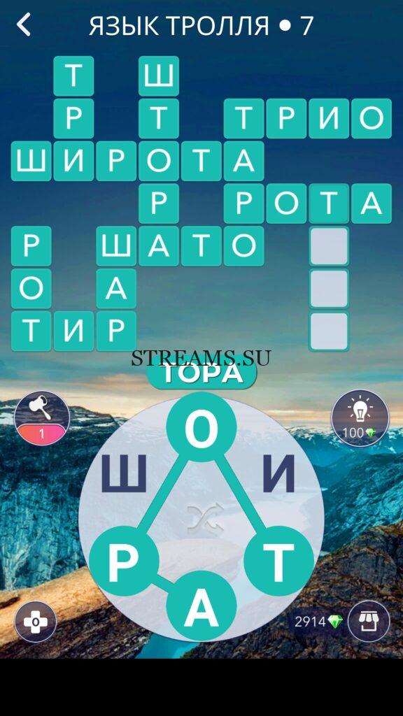 WOW ответы — Уровень 7: ЯЗЫК ТРОЛЛЯ. (550 — ВОЯЖ) В этом уровне нам нужно составить слова из следующих букв: «ШТАРОИ«. Готовы совершить кругосветное путешествие? Эта чудесная игра исполнит ваше желание! С каждым последующим уровнем, будет расти сложность заданий. Игра WOW создана в виде кроссворда, в котором нужно будет соединять буквы, чтобы получить несколько слов. Чем больше вы будете отгадывать слов, тем проще будет отгадать остальное. С помощью Words of Wonders вы сможете расширить свой словарный запас, улучшить внимательность и хорошенько прокачать свой мозг! Если вы не можете пройти один из уровней, воспользуйтесь подсказкой с нашего сайта.
