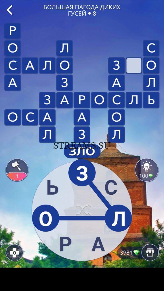 WOW ответы — Уровень 8: БОЛЬШАЯ ПАГОДА ДИКИХ ГУСЕЙ. (775 — ВОЯЖ) В этом уровне нам нужно составить слова из следующих букв: «ЗРСАЬЛО«. Готовы совершить кругосветное путешествие? Эта чудесная игра исполнит ваше желание! С каждым последующим уровнем, будет расти сложность заданий. Игра WOW создана в виде кроссворда, в котором нужно будет соединять буквы, чтобы получить несколько слов. Чем больше вы будете отгадывать слов, тем проще будет отгадать остальное. С помощью Words of Wonders вы сможете расширить свой словарный запас, улучшить внимательность и хорошенько прокачать свой мозг! Если вы не можете пройти один из уровней, воспользуйтесь подсказкой с нашего сайта.