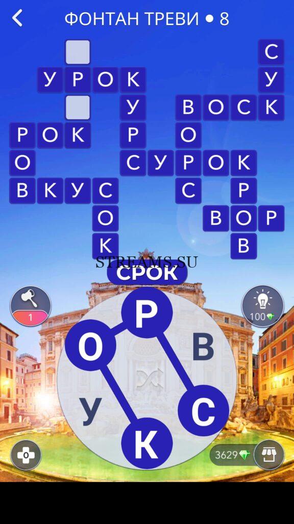 WOW ответы — Уровень 8: ФОНТАН ТРЕВИ. (711 — ВОЯЖ) В этом уровне нам нужно составить слова из следующих букв: «РВСКУО«. Готовы совершить кругосветное путешествие? Эта чудесная игра исполнит ваше желание! С каждым последующим уровнем, будет расти сложность заданий. Игра WOW создана в виде кроссворда, в котором нужно будет соединять буквы, чтобы получить несколько слов. Чем больше вы будете отгадывать слов, тем проще будет отгадать остальное. С помощью Words of Wonders вы сможете расширить свой словарный запас, улучшить внимательность и хорошенько прокачать свой мозг! Если вы не можете пройти один из уровней, воспользуйтесь подсказкой с нашего сайта.