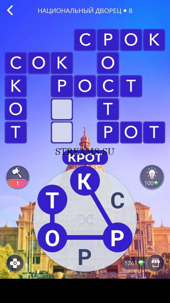 WOW ответы — Уровень 8: НАЦИОНАЛЬНЫЙ ДВОРЕЦ. (183 — ВОЯЖ) В этом уровне нам нужно составить слова из следующих букв: «СТРРКО«. Готовы совершить кругосветное путешествие? Эта чудесная игра исполнит ваше желание! С каждым последующим уровнем, будет расти сложность заданий. Игра WOW создана в виде кроссворда, в котором нужно будет соединять буквы, чтобы получить несколько слов. Чем больше вы будете отгадывать слов, тем проще будет отгадать остальное. С помощью Words of Wonders вы сможете расширить свой словарный запас, улучшить внимательность и хорошенько прокачать свой мозг! Если вы не можете пройти один из уровней, воспользуйтесь подсказкой с нашего сайта.