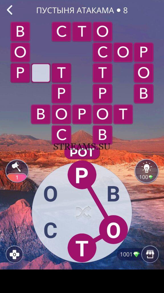WOW ответы — Уровень 8: ПУСТЫНЯ АТАКАМА. (103 — ВОЯЖ) В этом уровне нам нужно составить слова из следующих букв: «СОВТРО«. Готовы совершить кругосветное путешествие? Эта чудесная игра исполнит ваше желание! С каждым последующим уровнем, будет расти сложность заданий. Игра WOW создана в виде кроссворда, в котором нужно будет соединять буквы, чтобы получить несколько слов. Чем больше вы будете отгадывать слов, тем проще будет отгадать остальное. С помощью Words of Wonders вы сможете расширить свой словарный запас, улучшить внимательность и хорошенько прокачать свой мозг! Если вы не можете пройти один из уровней, воспользуйтесь подсказкой с нашего сайта.