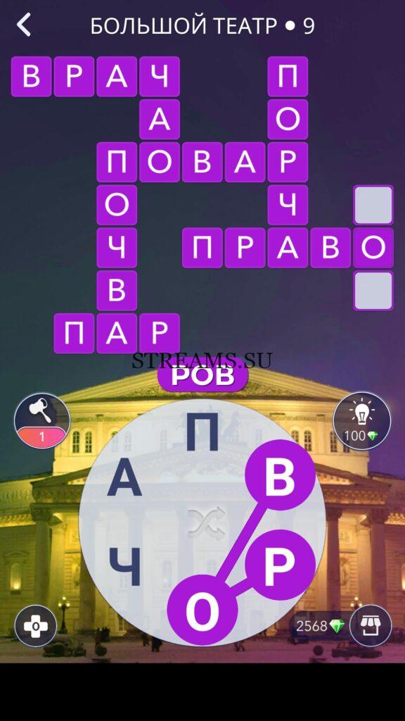 WOW ответы — Уровень 9: БОЛЬШОЙ ТЕАТР. (472 — ВОЯЖ) В этом уровне нам нужно составить слова из следующих букв: «АОПЧВР«. Готовы совершить кругосветное путешествие? Эта чудесная игра исполнит ваше желание! С каждым последующим уровнем, будет расти сложность заданий. Игра WOW создана в виде кроссворда, в котором нужно будет соединять буквы, чтобы получить несколько слов. Чем больше вы будете отгадывать слов, тем проще будет отгадать остальное. С помощью Words of Wonders вы сможете расширить свой словарный запас, улучшить внимательность и хорошенько прокачать свой мозг! Если вы не можете пройти один из уровней, воспользуйтесь подсказкой с нашего сайта.