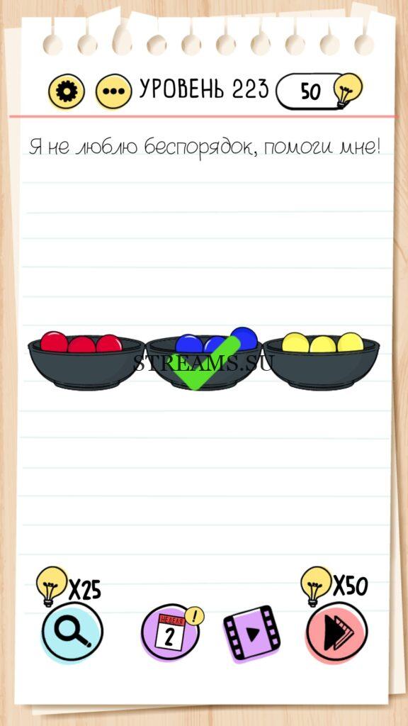 Я не люблю беспорядок, помоги мне! Уровень 223 — Brain Test — Это самая популярная головоломка, в которой вам предстоит разгадывать непростые задачки. Нужно будет искать нестандартные решения. Название игры говорит само за себя (Тест мозга). С её помощью вы сможете повысить свой IQ, и интеллект. Иногда ответ может быть очень прост. Вы можете играть в компании друзей или родных. Брейн Тест, это отличный способ провести время с пользой и узнать насколько ты умный. Но если вы не можете решить один или несколько уровней, то воспользуйтесь подсказками с нашего сайта.