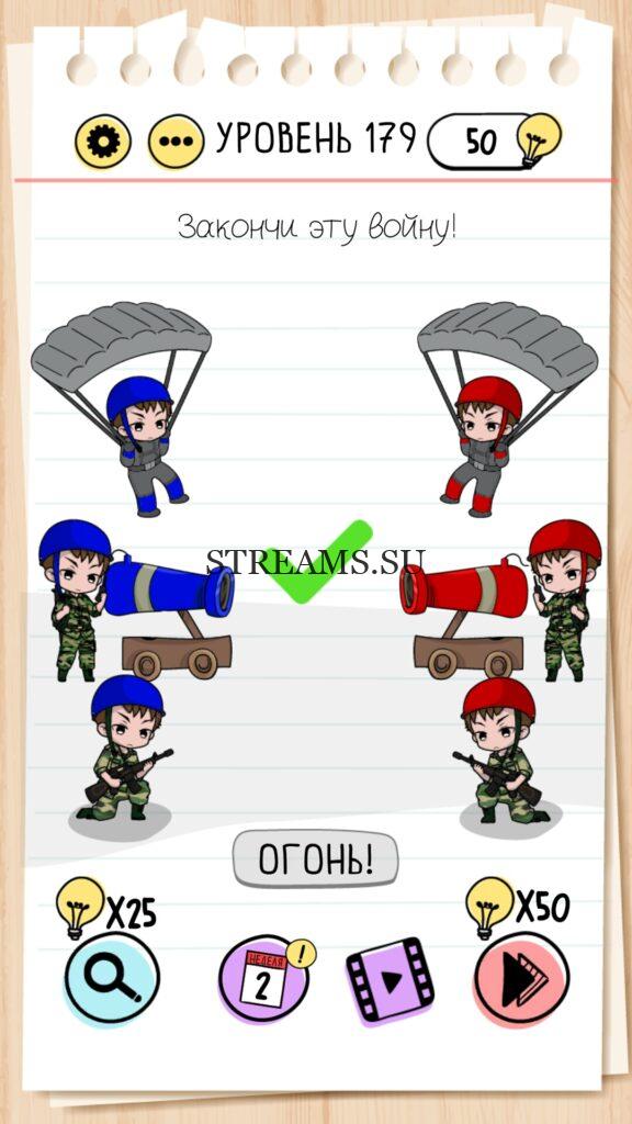 Закончи эту войну! Уровень 179 — Brain Test — Это самая популярная головоломка, в которой вам предстоит разгадывать непростые задачки. Нужно будет искать нестандартные решения. Название игры говорит само за себя (Тест мозга). С её помощью вы сможете повысить свой IQ, и интеллект. Иногда ответ может быть очень прост. Вы можете играть в компании друзей или родных. Брейн Тест, это отличный способ провести время с пользой и узнать насколько ты умный. Но если вы не можете решить один или несколько уровней, то воспользуйтесь подсказками с нашего сайта.