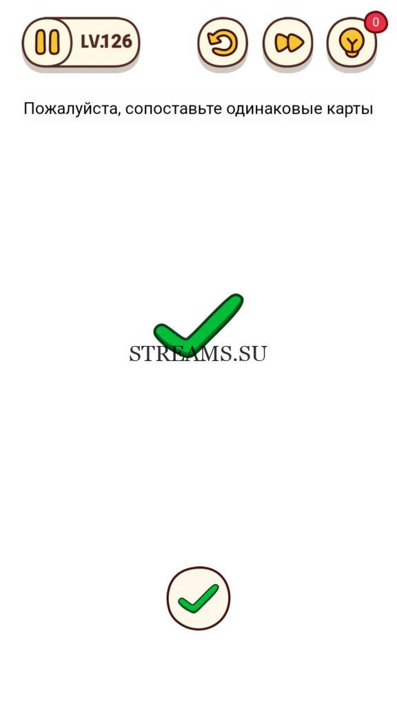 Запомните положение каждой карты. Уровень 126 — Brain Find – уникальная игра в жанре «головоломка», ответ находится чуть ниже. Она имеет множество уровней и подуровней, которые весело проходить, без особых усилий и траты нервов. Игра нравится многим пользователям из-за приятного музыкального ряда, сопровождающегося весь игровой процесс. Тонко выполненной анимации и красивой графики, над которой поработали разработчики и вложили душу. Уникальность проекта состоит в том, что можно поворачивать экран на некоторых заданиях, увеличивать громкость динамика. То есть, всецело взаимодействовать не только с дисплеем, но и со всем мобильным устройством. На данный момент таких игр мало и не все они доступны в бесплатной версии! Brain Find переведена на русский язык. На нашем сайте, можно получить подсказки, если не получается пройти дальше.