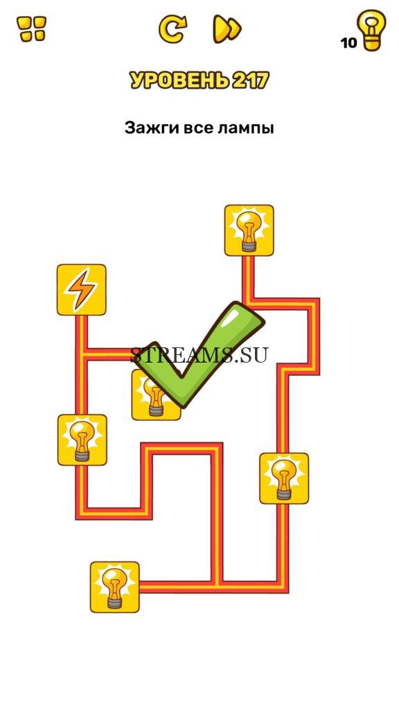 Зажги все лампы. Уровень 217 — Brain Blow: Тест на гениальность — Ответ на этот уровень находится под фото. Очередная игра от популярных разработчиков головоломок CASUAL AZUR GAMES. Если вы хотите взорвать свой мозг и развить навыки нестандартного мышления, тогда игра Брейн Блоу определенно вам понравится. Если не получается решить задание, то попробуйте включить нестандартное мышление, тряхнуть телефон, погладить его или использовать больше пальцев. Эта игра способна развить в вас навыки следопыта, креативность и прокачать ваш IQ. Но, а если все-же не получается пройти уровень, найдите правильное решение на нашем сайте.