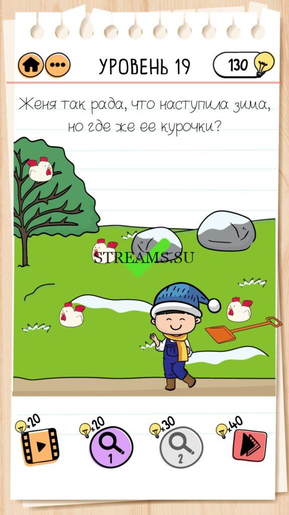 Женя так рада, что наступила зима, но где же её курочки? Уровень 19 — Brain Test 2 (Женина ферма): Вторая часть замечательной игры уже здесь. Готовы к испытанию своего мозга на прочность? Тогда смело залетайте в эту головоломку. Здесь нас ждет непредсказуемые задачки, вопросы и головоломки, которые сразу и не получиться решить. Будьте готовы к вопросам с подвохом! Попробуйте решить все уровни. Эта головоломка построена по принципу историй. В каждой истории придется помогать кому-то решить бытовые вопросы; вычислить преступника; помочь похудеть. Это лишь некоторые эпизоды которые нас ожидают в этой игре. Очень красочная игра, которая понравится и вам и вашим друзьям. Если не получается пройти загадку, то на нашем сайте STREAMS.SU вы найдете решение любого уровня Brain Test 2!