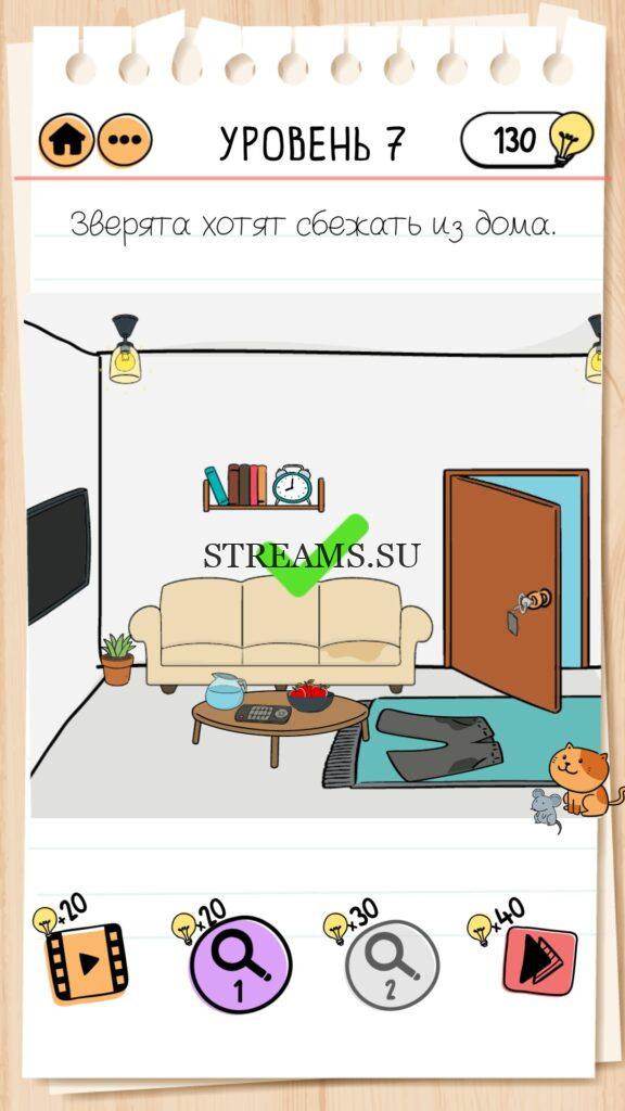 Зверята хотят сбежать из дома. Уровень 7 — Brain Test 2 (Приключения Васьки): Вторая часть замечательной игры уже здесь. Готовы к испытанию своего мозга на прочность? Тогда смело залетайте в эту головоломку. Здесь нас ждет непредсказуемые задачки, вопросы и головоломки, которые сразу и не получиться решить. Будьте готовы к вопросам с подвохом! Попробуйте решить все уровни. Эта головоломка построена по принципу историй. В каждой истории придется помогать кому-то решить бытовые вопросы; вычислить преступника; помочь похудеть. Это лишь некоторые эпизоды которые нас ожидают в этой игре. Очень красочная игра, которая понравится и вам и вашим друзьям. Если не получается пройти загадку, то на нашем сайте STREAMS.SU вы найдете решение любого уровня Brain Test 2!